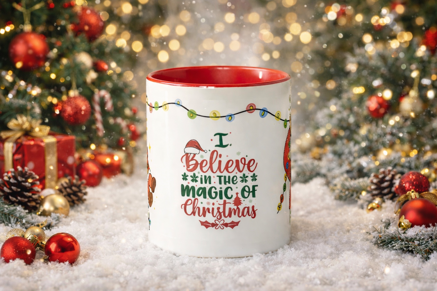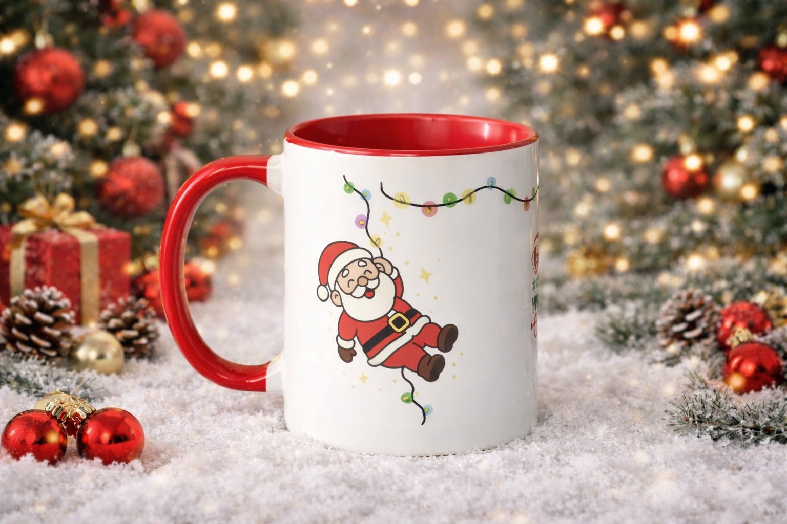 Embrace the warmth of the season with this charming, multi-sided Christmas mug. Featuring a festive red interior and handle, this ceramic mug is designed to bring a touch of holiday magic to your morning coffee or evening cocoa.